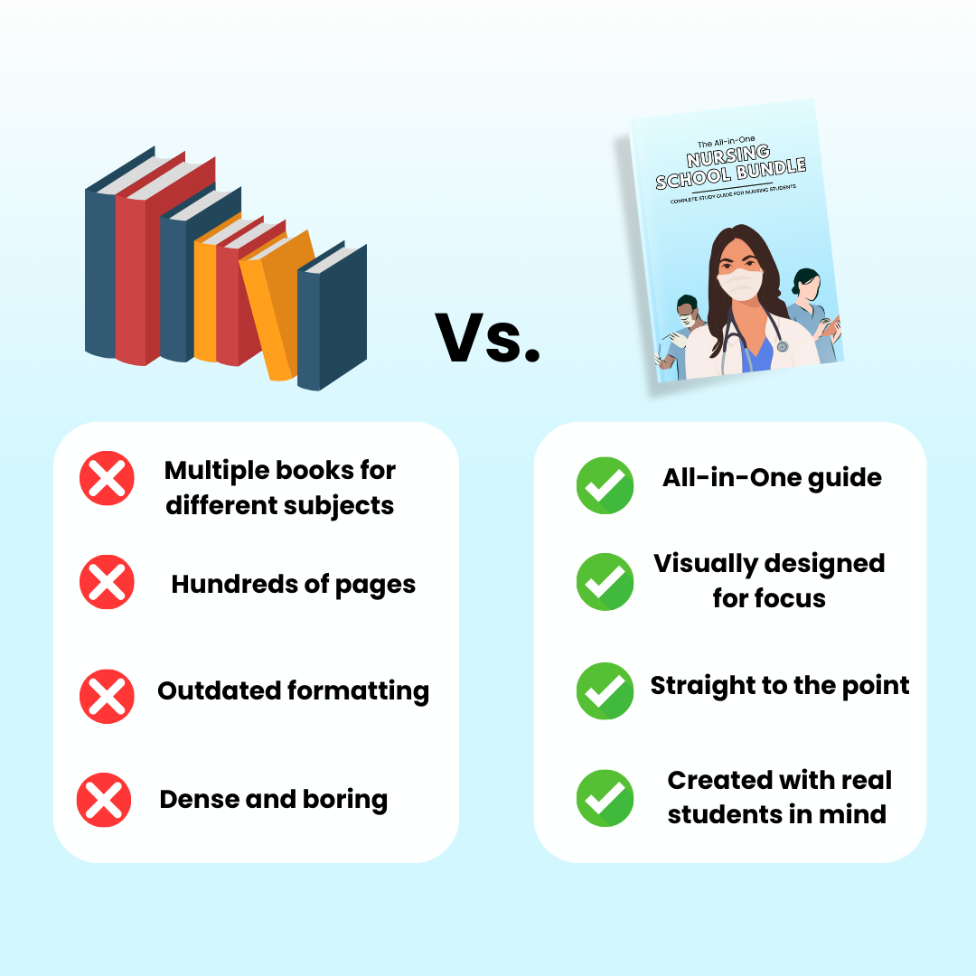 Great question! The All-in-One Nursing School Bundle is a complete nursing school study guide that breaks down complex nursing school topics and subjects.
